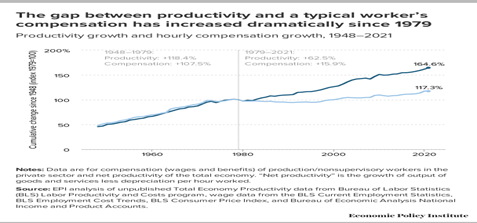 Until 1979, labor’s compensation rose in tandem with labor productivity. But then the gap widened so that labor productivity has increased 64.7 percent from 1979 to 2021, whereas a typical worker’s compensation increased just 17.3 percent, not even keeping up with inflation.