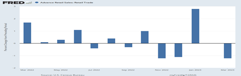 It is a sign that consumers are beginning to seriously cut back on spending, which affects other sectors. The Fed showed manufacturing production dropped 0.5 percent in March after increasing 0.6 percent in February. Durable goods lasting more than three years have been down the past two months.