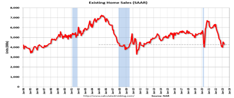 The Calculated Risk graph tell us why. As interest rates rose home sales declined. The sharp rise in interest mirrors the sharp decline in sales over the same time period—beginning January 2022 when everyone knew the Fed was in earnest about suppressing inflation.
