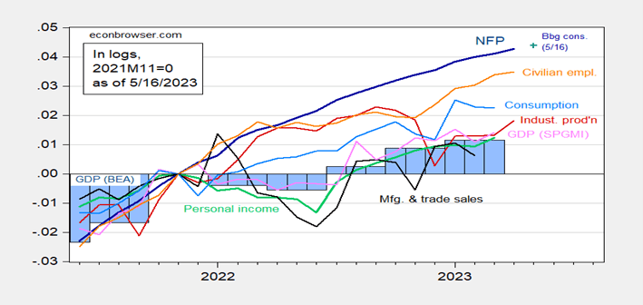 The Econbrowser blog puts out an interesting graph that shows what is keeping economic growth from collapsing into recession territory. It’s the rising NFP (nonfarm payroll) number coupled with a surge in industrial production (pink line). Two other sectors that the National Bureau of Economic Research (NBER) business cycle dating committee scrutinizes to call a recession—personal income, consumption, and Mfg. & trade sales—have stalled.