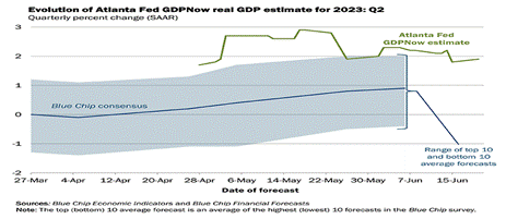 “The GDPNow model estimate for real GDP growth (seasonally adjusted annual rate) in the second quarter of 2023 is 1.9 percent on June 20, up from 1.8 percent on June 15. After this morning’s housing starts report from the US Census Bureau, the nowcast of second-quarter real residential investment growth increased from -2.1 percent to 2.2 percent.”