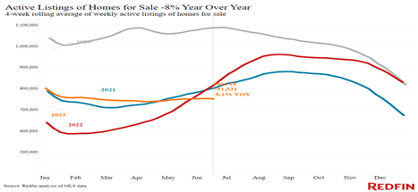 An analysis by Redfin, the national real estate and housing finance entity, showed active listings still high in June, but down -8.1 percent YOY from 2021 and 2022 per the Redfin graph of active listings below.