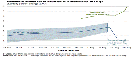 “The GDPNow model estimate for real GDP growth (seasonally adjusted annual rate) in the third quarter of 2023 is 5.8 percent on August 16, up from 5.0 percent on August 15. After this morning’s housing starts report from the US Census Bureau and industrial production report from the Federal Reserve Board of Governors, the nowcasts of third-quarter real personal consumption expenditures growth and third-quarter real gross private domestic investment growth increased from 4.4 percent and 8.8 percent, respectively, to 4.8 percent and 11.4 percent,” said the Atlanta Fed.