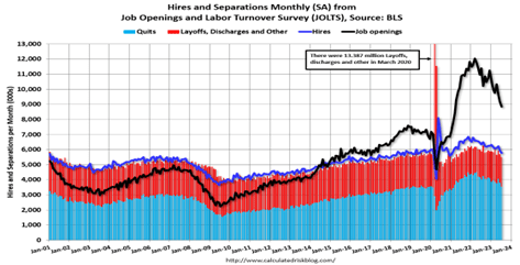 The latest Job Openings and Labor Turnover Survey (JOLTS) report by the BLS shows there are still a lot of job openings, but that should continue to decline from the post-pandemic high of 12 million job vacancies in 2022.