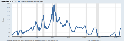 So, it is useful to look at interest rates as an indicator of what is normal—namely the Fed Funds rate that the Fed has jacked up to 5.25 percent (per above graph) and the Bank Prime Loan rate—which controls consumer spending and therefore economic growth and job formation—to determine what the U.S. economy might look like over next few years.
