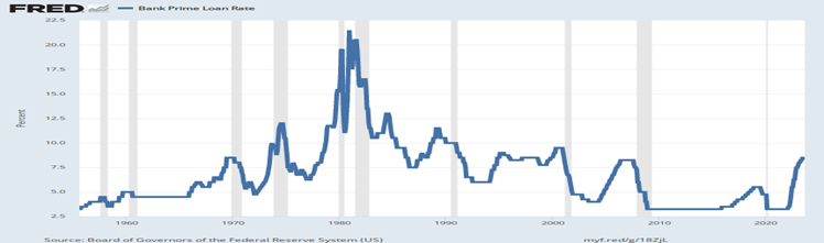 That is too high for any sustained growth. The Bank Prime Loan Rate fluctuated from 7.5 to 10 percent in the 1970s to 2000, as did a higher unemployment rate, before unemployment descended to its current 3 percent lows after the Great Recession (2009), and which is causing the current growth spurt.