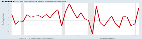 I maintain there’s also another reason, a rise in what is called multifactor productivity, which measures capital inputs (machines, new technologies) as well as labor productivity, and it is soaring per the below FRED graph. It rose to 3.6 percent in 2021 from zero in 2020. This will create a greater supply of things, which puts downward pressure on prices, as do more workers producing more.