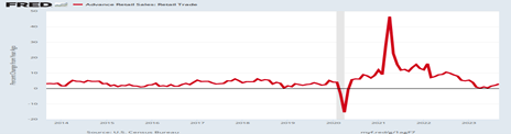 Well, retail sales might save us from a recesssion. Sales are surging, far above consensus estimates, recovering from negative sales growth in February and March 2023. Consumers are supposed to slow spending when the Fed raises the cost of borrowing, aren’t they? What is going on?