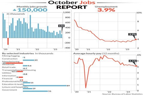 We will have to wait longer for a recession. October’s Jobs report showed even the unsettled labor strikes didn’t make much of a dent in the labor market. The usual suspects—leisure activities, healthcare, and a booming construction industry gave the most boost to hiring, but new government jobs were one third of the total 150,00 nonfarm payroll jobs created.