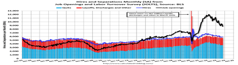 “The number of job openings decreased to 8.7 million on the last business day of October, the U.S. Bureau of Labor Statistics reported today. Over the month, the number of hires and total separations changed little at 5.9 million and 5.6 million, respectively. Within separations, quits (3.6 million) and layoffs and discharges (1.6 million) changed little.”