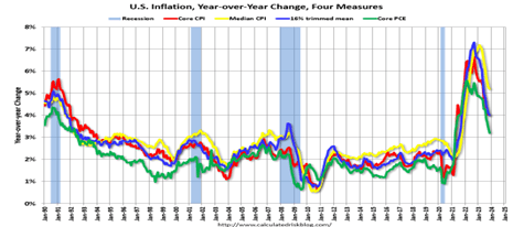 Calculated Risk’s colorful graph of various inflation indicators (gray bars are recessions) shows the history of Core CPI (red line) and Core PCE (green line) inflation from January 1990, among others. Core prices are without more volatile food and energy prices.