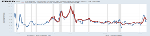 So, what does that tell us about monetary policy that is the Feds playing field? It has taken great recessions or WWII (i.e., widest gray bars in graph) to bring down inflation to the Fed’s 2 percent target.
