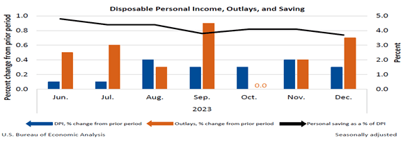 Personal consumption expenditures (PCE) are portrayed in the above BEA graph. The higher orange line is outlays (i.e., increased spending) and shorter blue bar Disposable Income (after taxes, etc.).