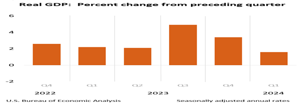 First quarter GDP growth was 1.6 percent, below expectations, after 3.4% growth in Q4 and 4.6% growth in Q3 2023.