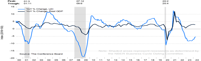 But at the same time the LEI said in the six-month period between October 2023 and April 2024, the LEI contracted by -1.9 percent—a smaller decrease than its -3.5 percent decline over the previous six months, hence the blue line in its graph showed improvement while GDP black line in graph declined slightly from last year’s +3 percent growth rate.