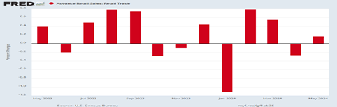 “Advance estimates of U.S. retail and food services sales for May 2024, adjusted for seasonal variation and holiday and trading-day differences, but not for price changes, were $703.1 billion, up 0.1 percent (±0.4 percent) * from the previous month, and up 2.3 percent (±0.5 percent) above May 2023,” said the U.S. Census Bureau.