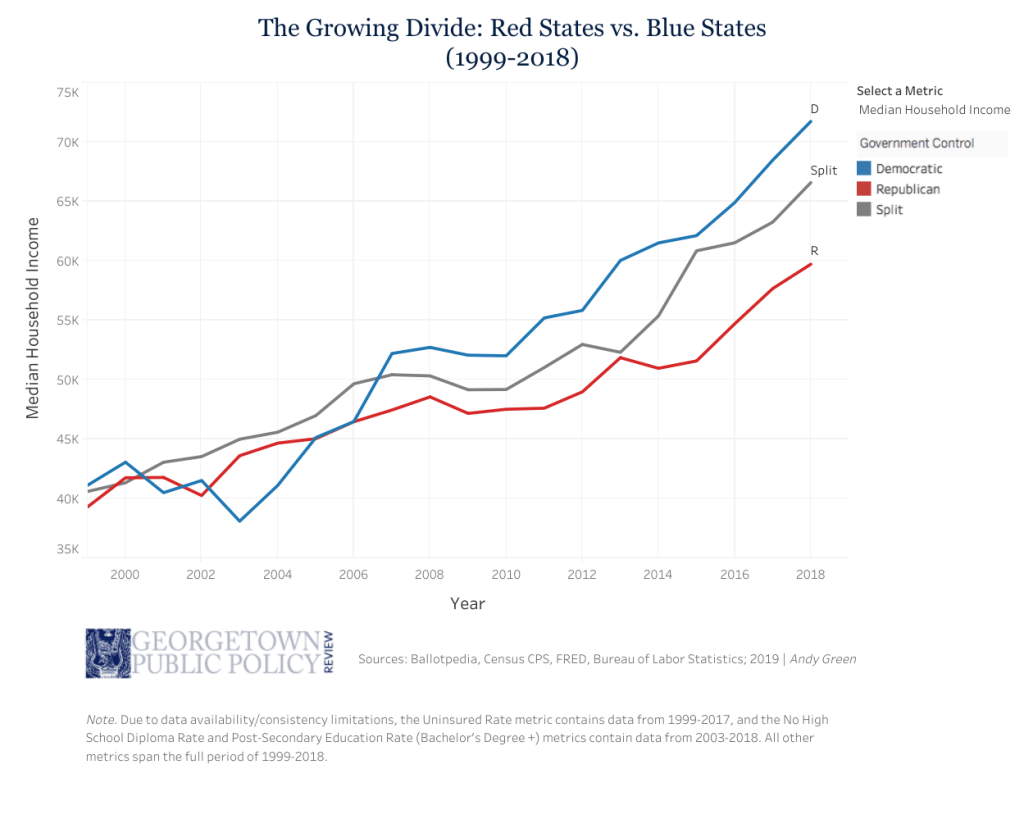 A Georgetown Public Review measured the different median household incomes of red and blue states in the U.S.–$74,000 in blue states vs. $60,000 in red states. It’s in part because most red states have lower minimum wages, and fewer social services such as healthcare for their citizens. And even those social services are mostly subsidized by the federal government.