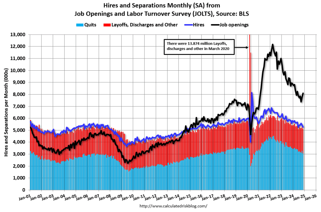 Surveys such as the US Labor Department’s Job Openings and Labor Turnover Survey (JOLTS) report as portrayed in the above graph are saying that consumers’ jobs are still safe. Then why so much angst that things might get worse? Polls seem to be buffeted by the latest political winds, especially with Trump’s repeated assertions that our economy is in terrible shape.