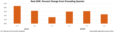 Real gross domestic product (GDP) increased at an annual rate of 2.3 percent in the fourth quarter of 2024 (October, November, and December), according to the advance estimate released by the U.S. Bureau of Economic Analysis. In the third quarter, real GDP increased 3.1 percent.