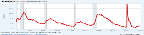 Looking at past history in the FRED graph of the unemployment rate to predict what will happen next, with the six gray bars indicating recessions since 1980, won’t help much. The unemployment rate rose sharply after the last recessions began.