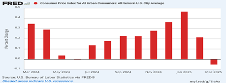 “The Consumer Price Index for All Urban Consumers (CPI-U) decreased 0.1 percent on a seasonally adjusted basis in March, after rising 0.2 percent in February, the U.S. Bureau of Labor Statistics reported today. Over the last 12 months, the all items index increased 2.4 percent before seasonal adjustment.”