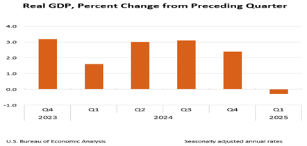 “Real gross domestic product (GDP) decreased at an annual rate of -0.3 percent in the first quarter of 2025 (January, February, and March), according to the advance estimate released by the U.S. Bureau of Economic Analysis. In the fourth quarter of 2024, real GDP increased 2.4 percent.”