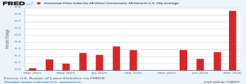 The all-items consumer index rose the most—3.3 percent for the 12 months ending March, after rising 2.4 percent for the 12 months ending February. It rose 2.6 percent less food and energy over the year. The energy index increased 12.5 percent for the 12 months ending March, as a result of the Iran war.