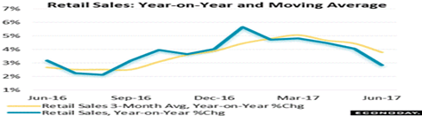 Second quarter GDP came in at a 2.6 percent annualized growth rate. This is one of the best showings of the last 2 years and keeps overall growth at 2 percent; because first quarter’s growth was downwardly revised to 1.2 percent. And Q3 growth isn’t looking good, as June personal income and expenditures (PCE) just took a huge plunge—not a good omen for Q3.